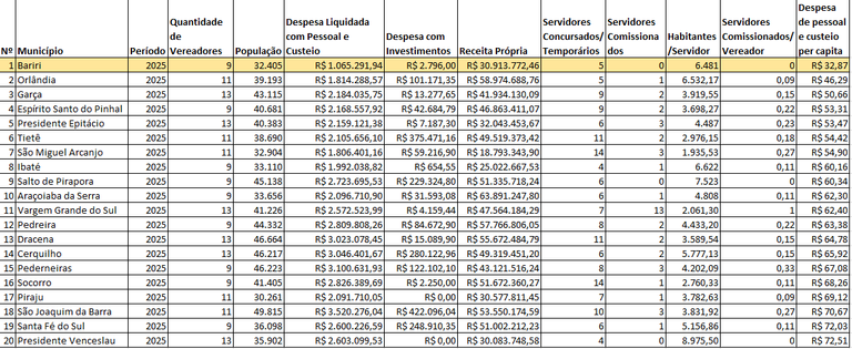 Com a população estimada (IBGE) de 32.405 moradores, o município de Bariri contabiliza o menor valor despendido por número de habitantes. A Câmara Municipal custou R$ 1.065.291,94 no acumulado 12 meses até Abril/2025, frente a uma arrecadação municipal da ordem de R$ 30.913.772,46. O gasto per capita calculado e registrado pela Câmara de Bariri (segundo a ferramenta "Mapa das Câmaras" do TCESP) foi no valor de R$ 32,87, sendo o MENOR dentre os municípios do estado de São Paulo.
